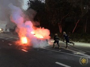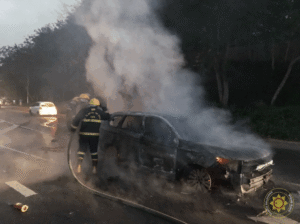 The Mitsubishi Outlander, registered GE 3557-24, ignited around 6:00 p.m. while traveling toward Larteh, engulfing the car in flames within minutes. Firefighters from the Akropong Fire Station, led by ADO I Brenya, arrived promptly to find the vehicle fully ablaze.